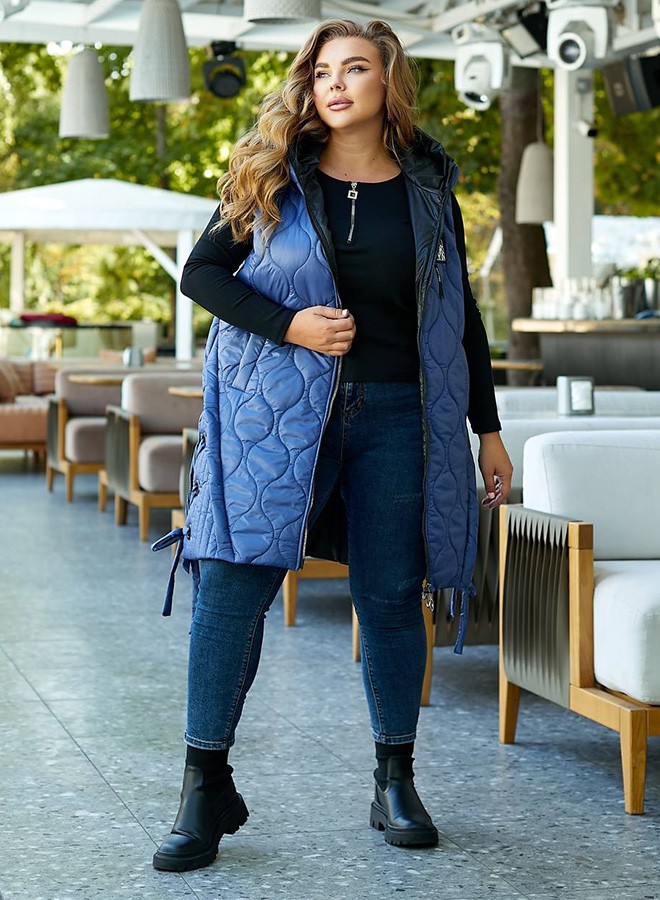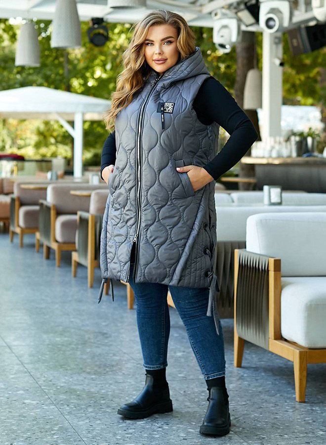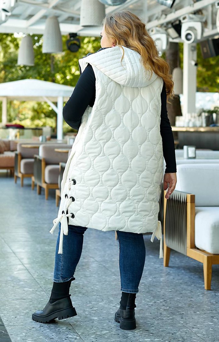 Стильна стьобана жилетка цікавого крою із зав'язками з боків, зручний глибокий капюшон, якісна фурнітура, нашивка.