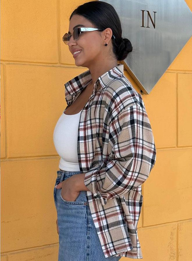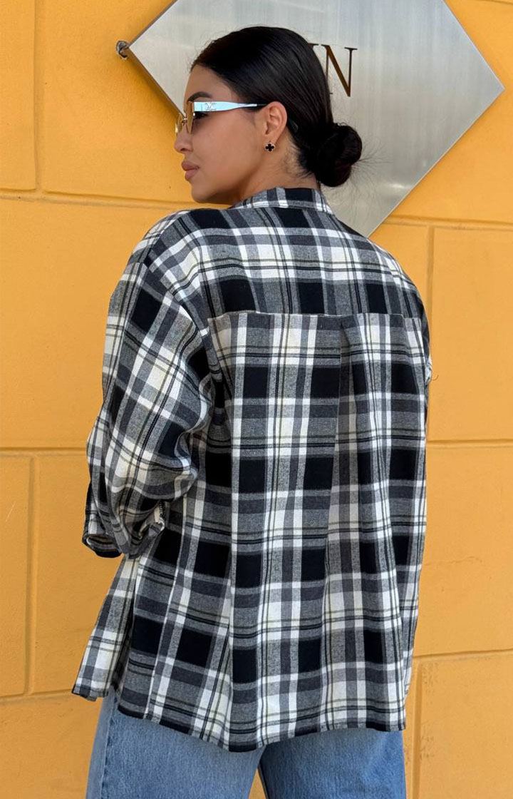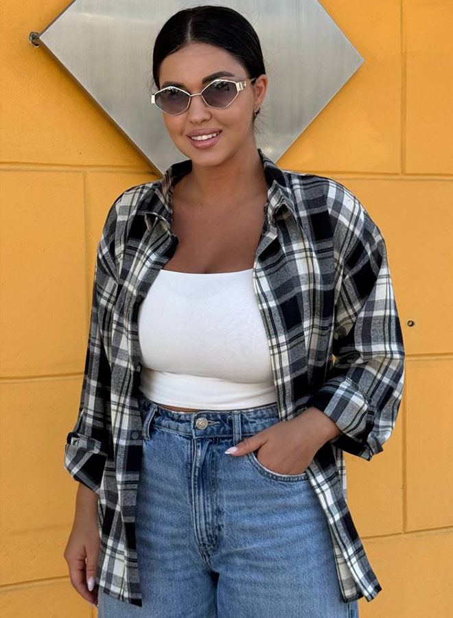 Універсальна сорочка оверсайз зі спущеним рукавом, по спинці – кокетка, застібається на кнопки. Рукав довгий на манжеті, підгорнутий на три чверті пасує краще.